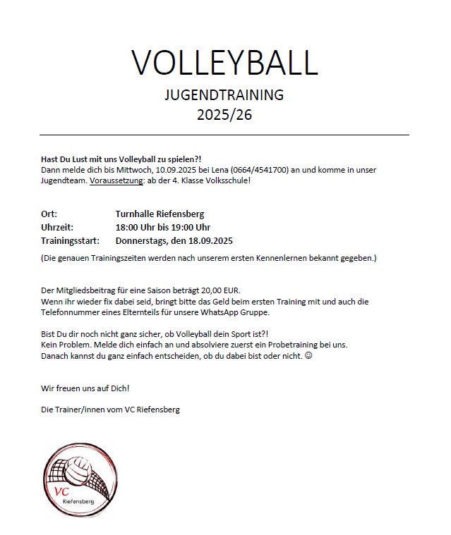 Wir starten am Donnerstag, den 05.09.2024 mit unserem Hallentraining in der Turnhalle in Riefensberg.
